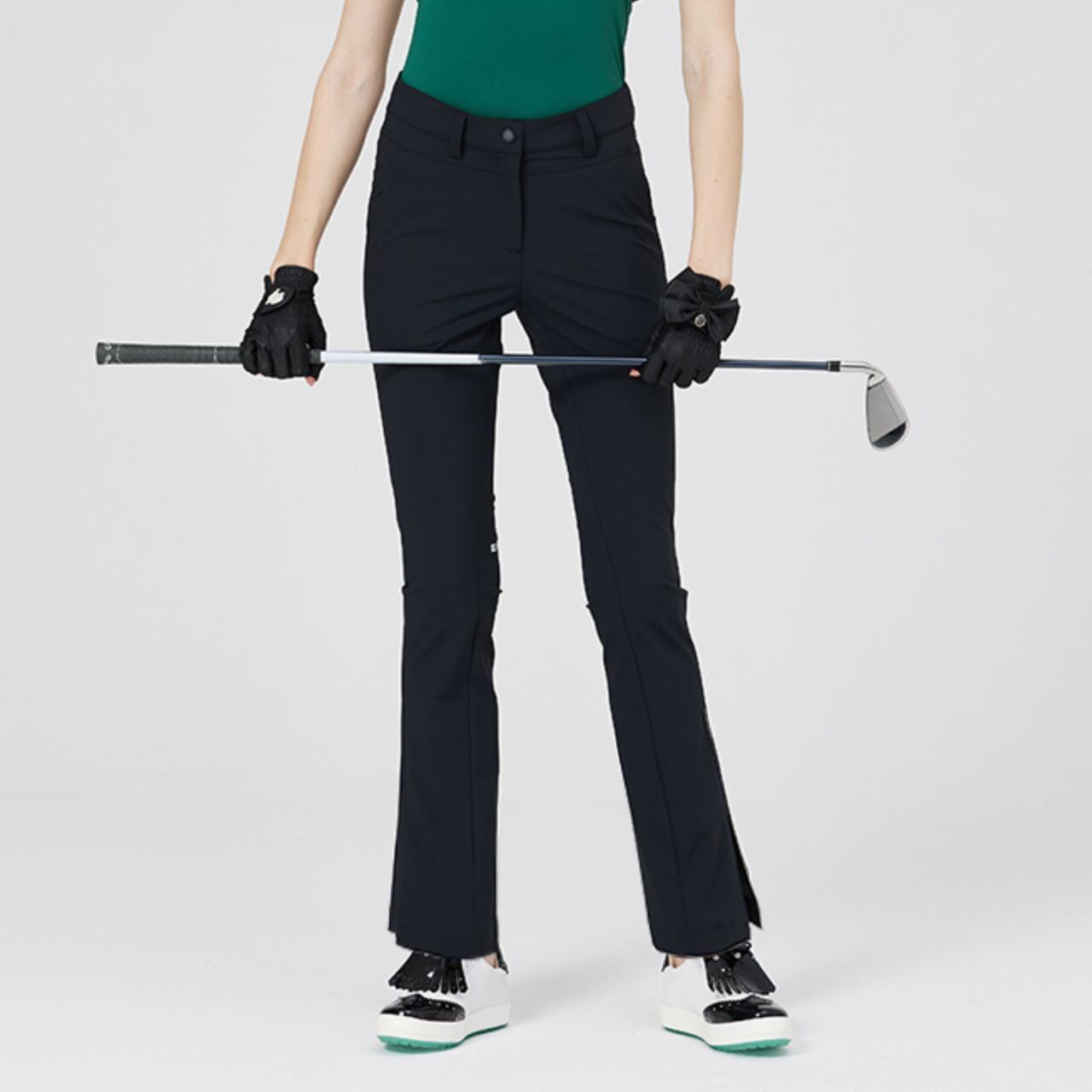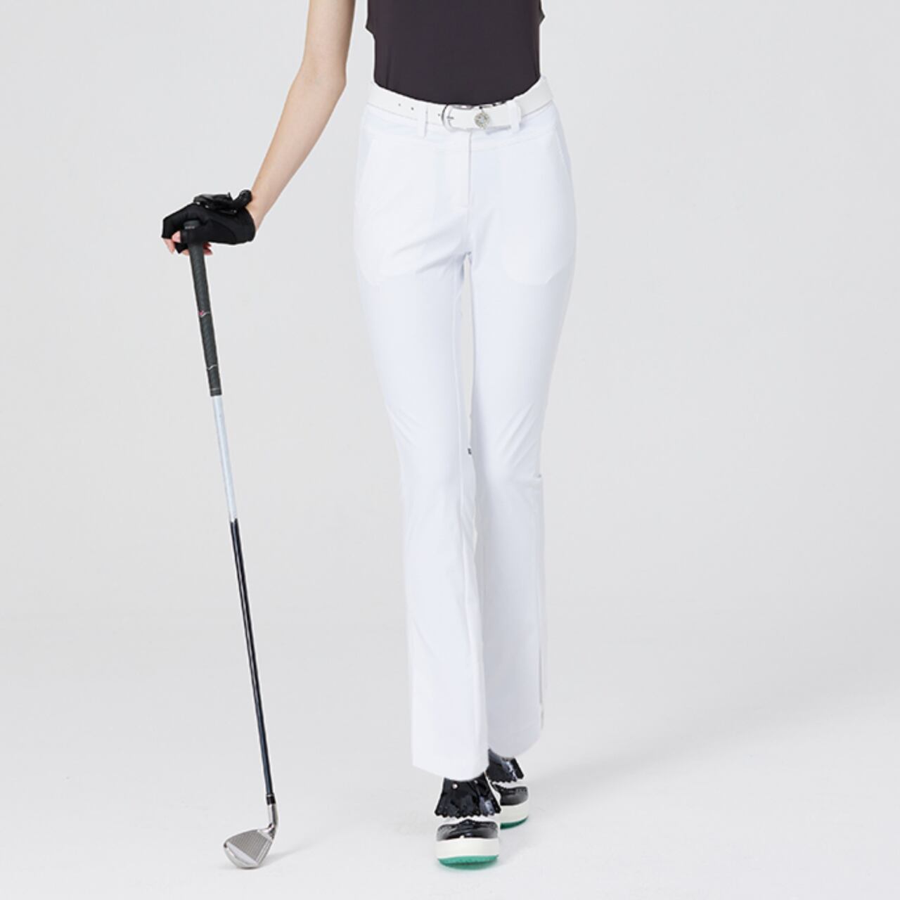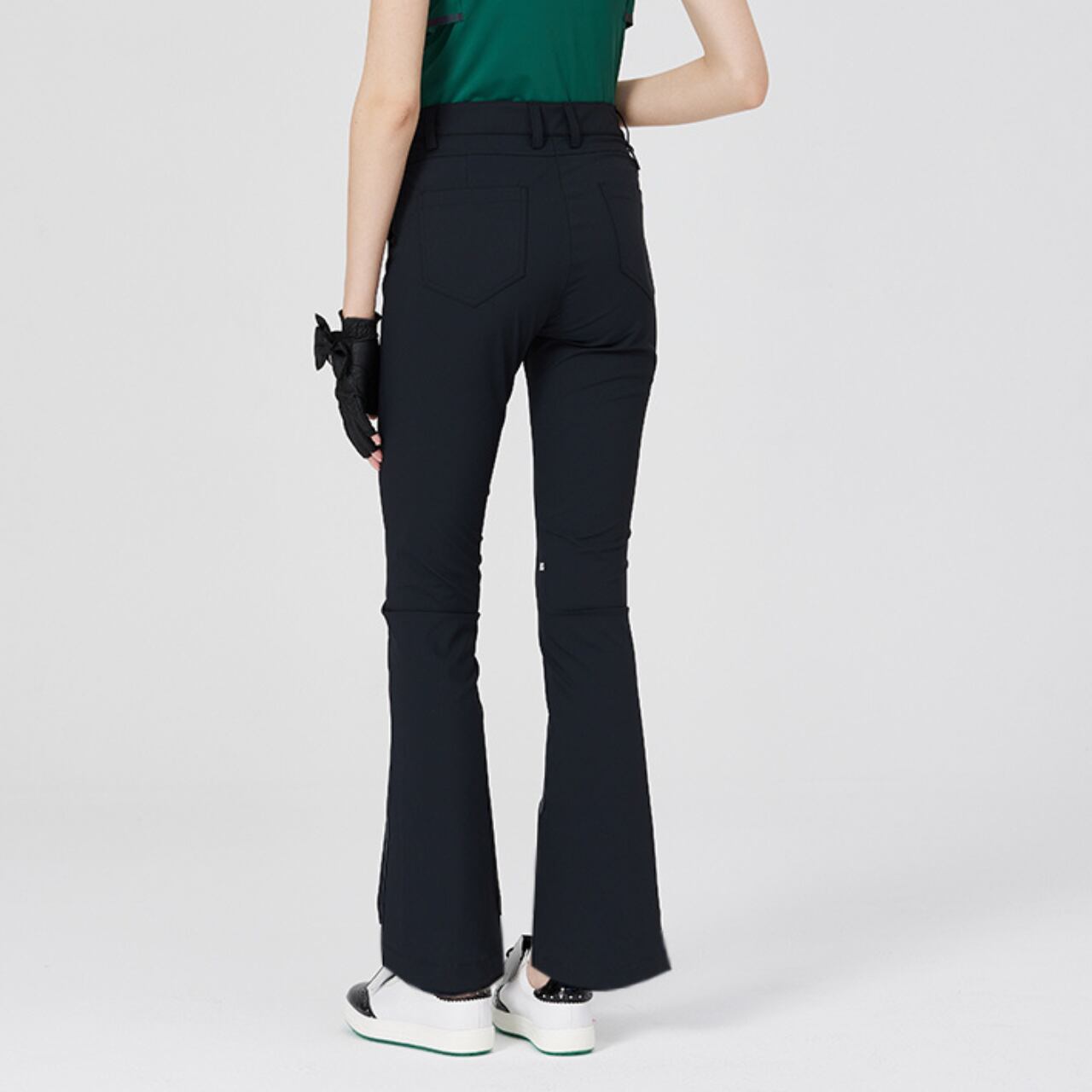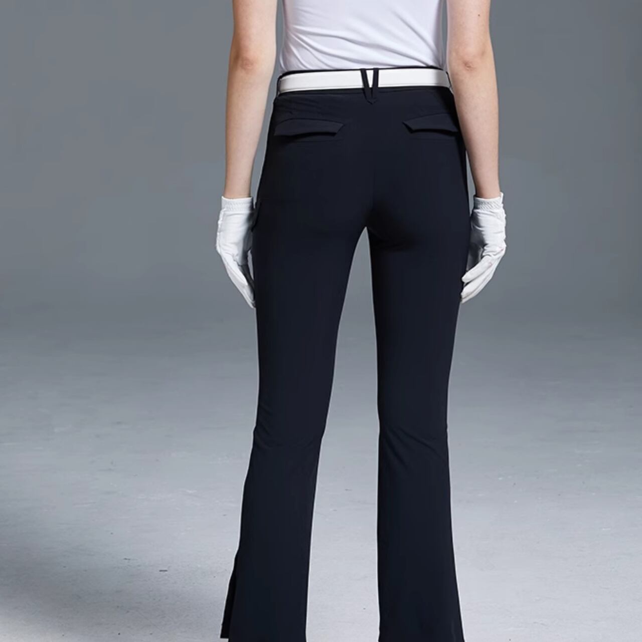こちらのパンツは、ゴルフシーンに最適なスタイリッシュなフレアパンツです。高めのウエストデザインが腰回りをしっかりサポートし、美しいシルエットを演出します。シンプルながらも洗練されたデザインは、カジュアルからスポーティーなスタイルまで幅広く対応可能ですので、ゴルフだけでなく日常のコーディネートにも活躍します。