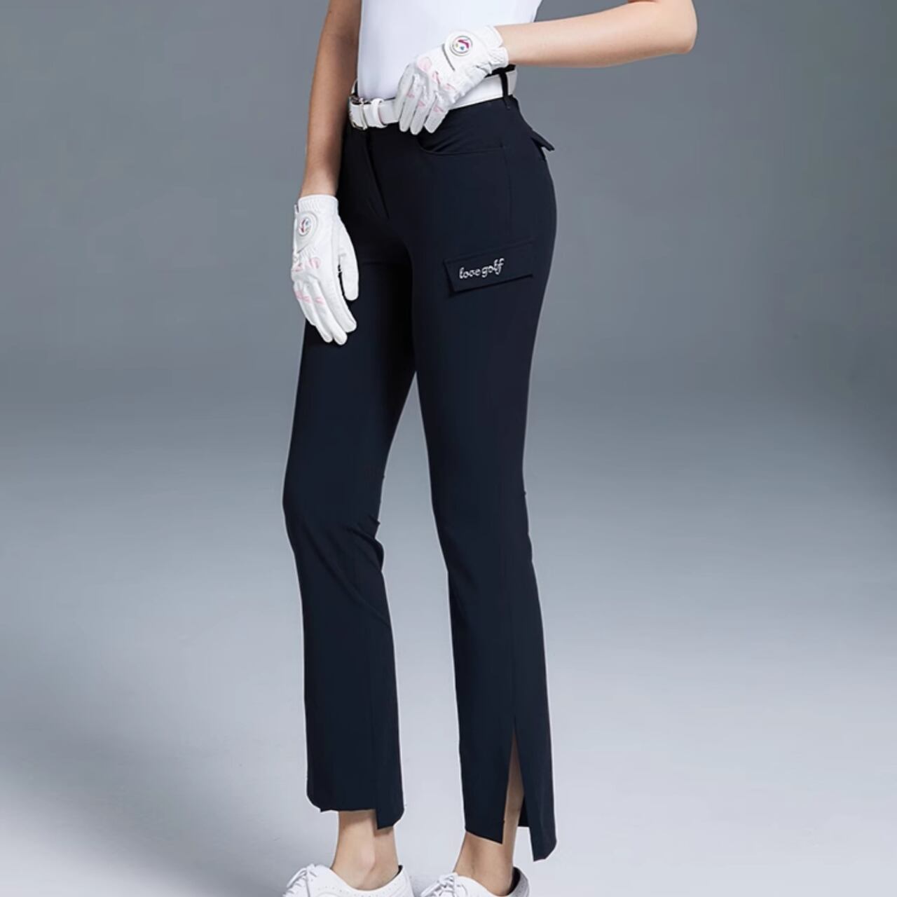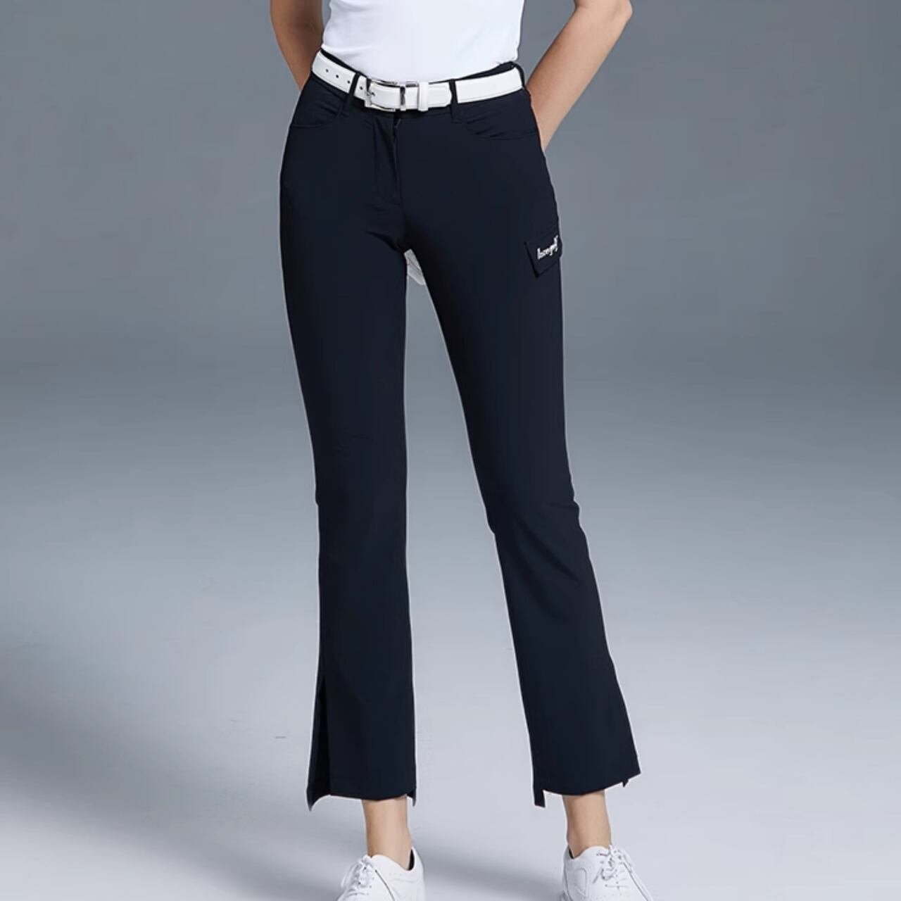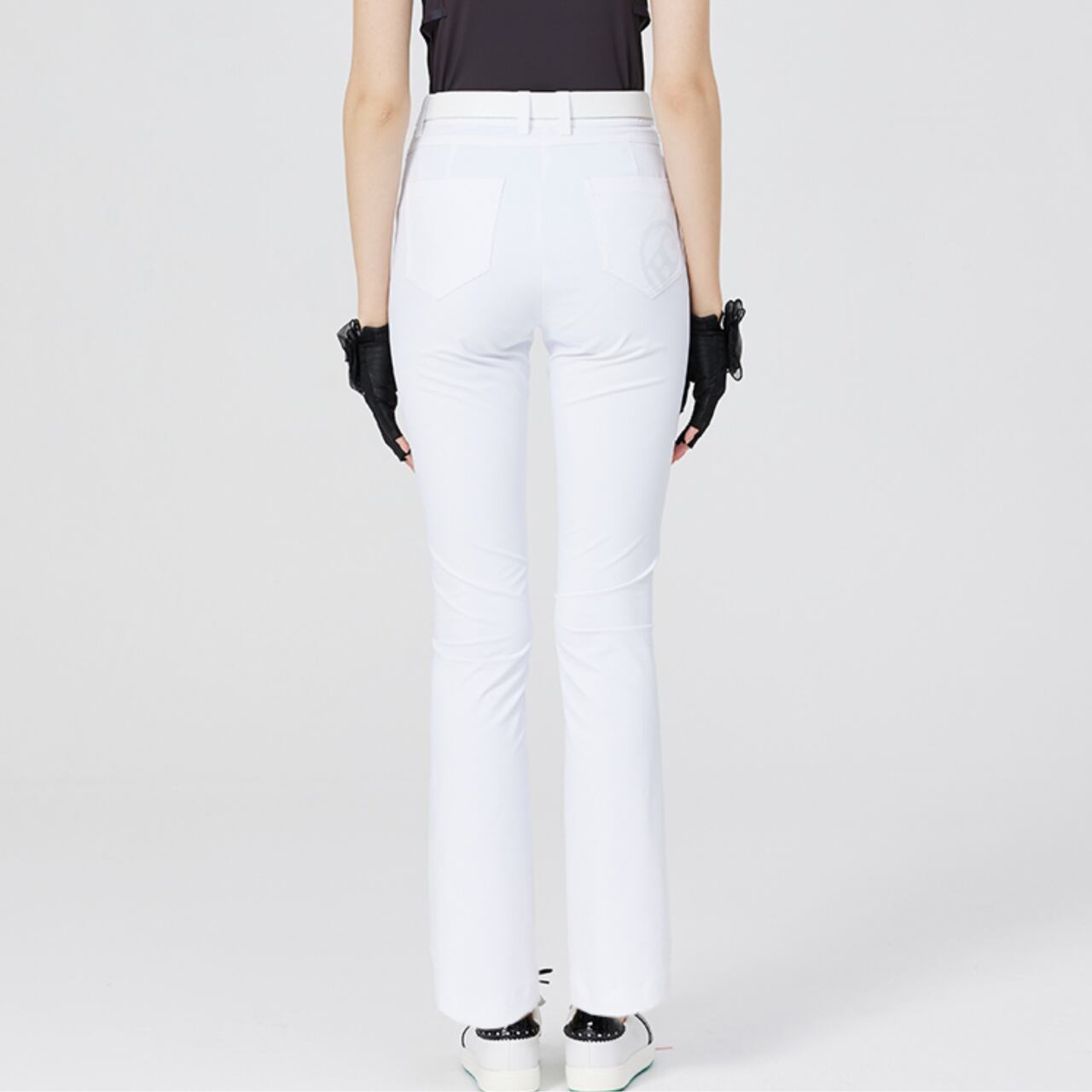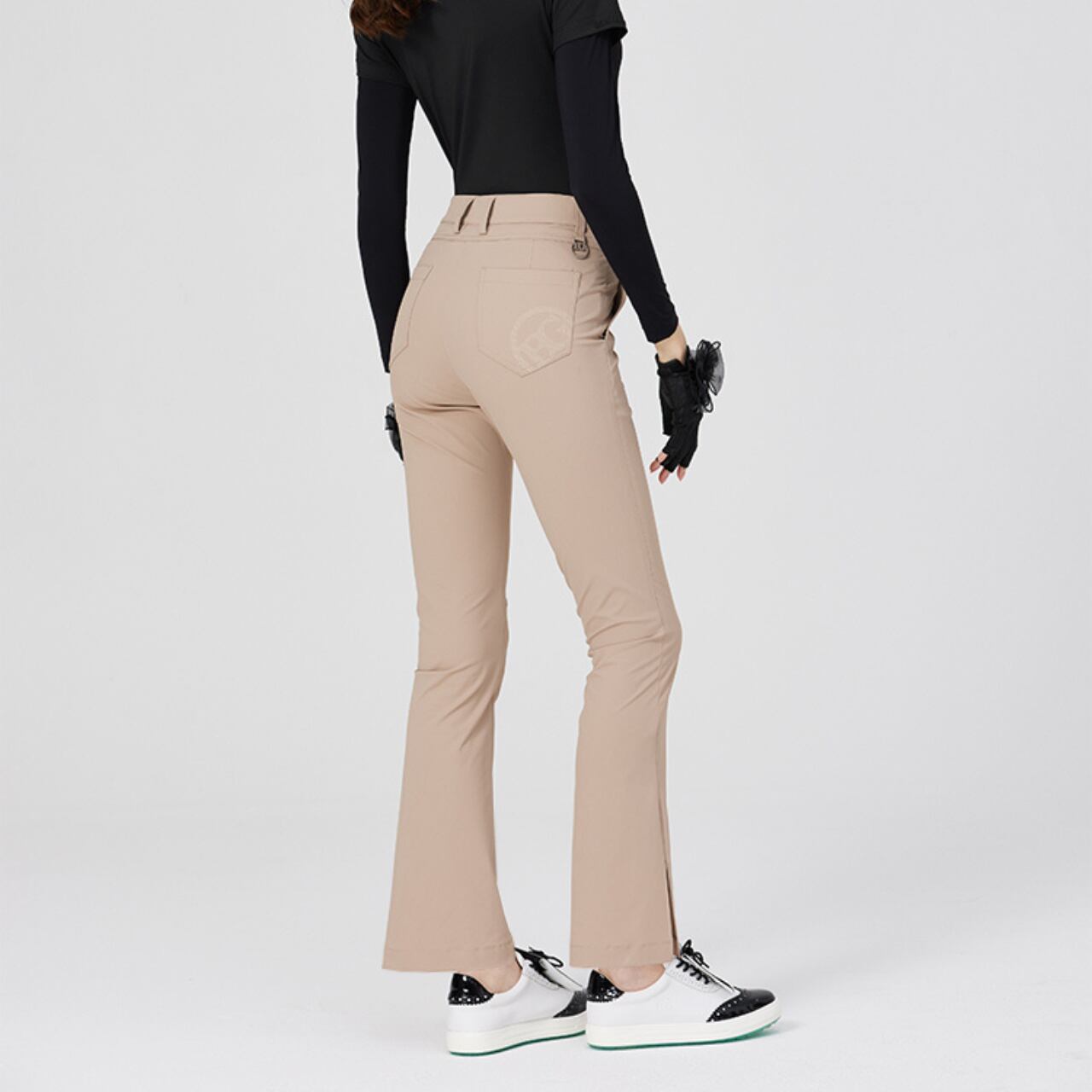 こちらのパンツは、ゴルフシーンに最適なスタイリッシュなフレアパンツです。高めのウエストデザインが腰回りをしっかりサポートし、美しいシルエットを演出します。シンプルながらも洗練されたデザインは、カジュアルからスポーティーなスタイルまで幅広く対応可能ですので、ゴルフだけでなく日常のコーディネートにも活躍します。